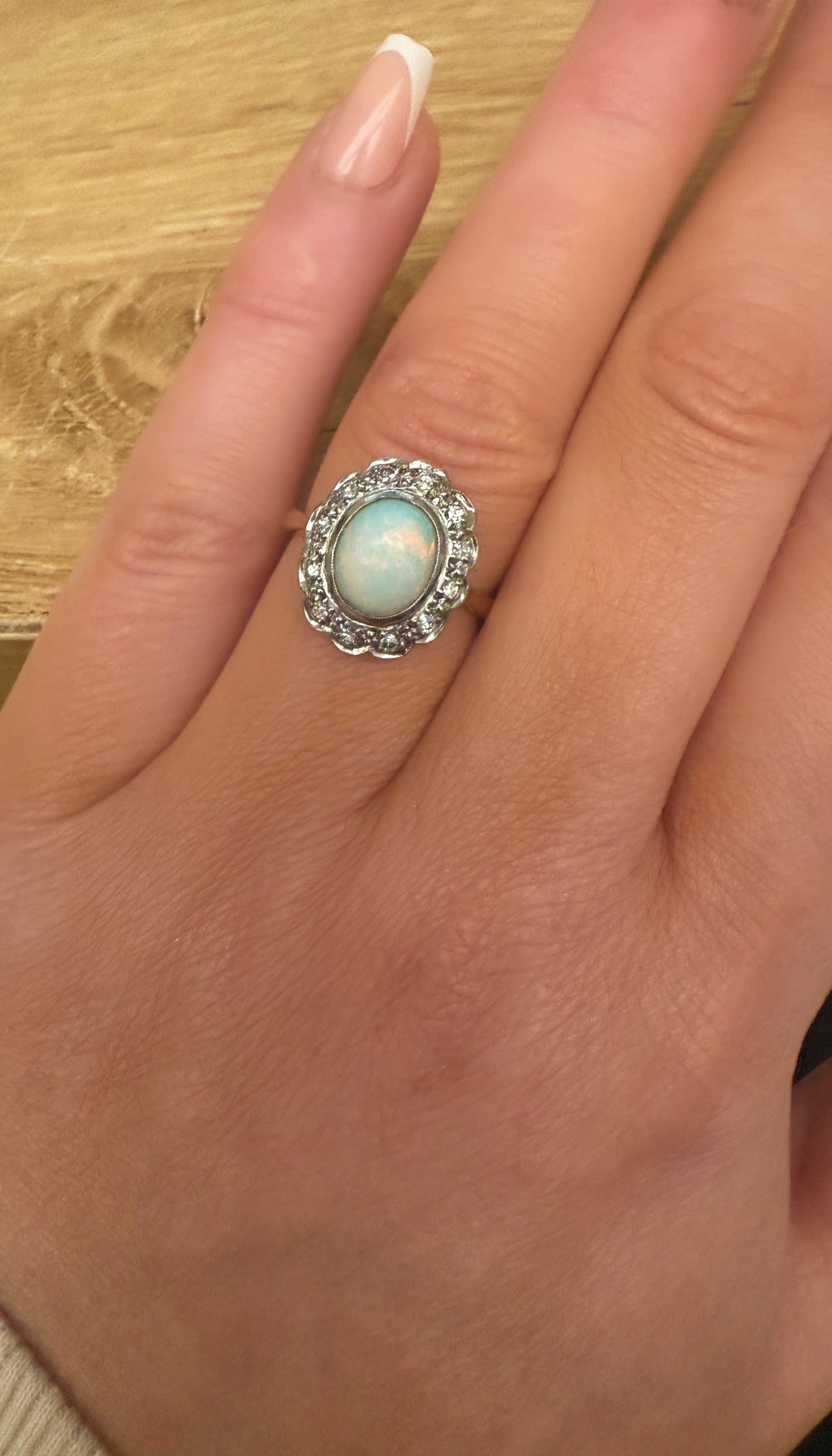 An exceptionally beautiful antique natural solid Opal & Diamond halo cluster ring