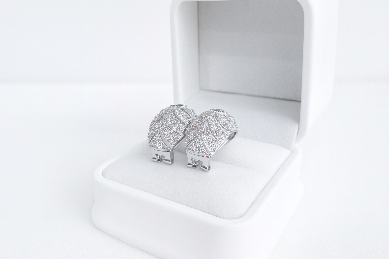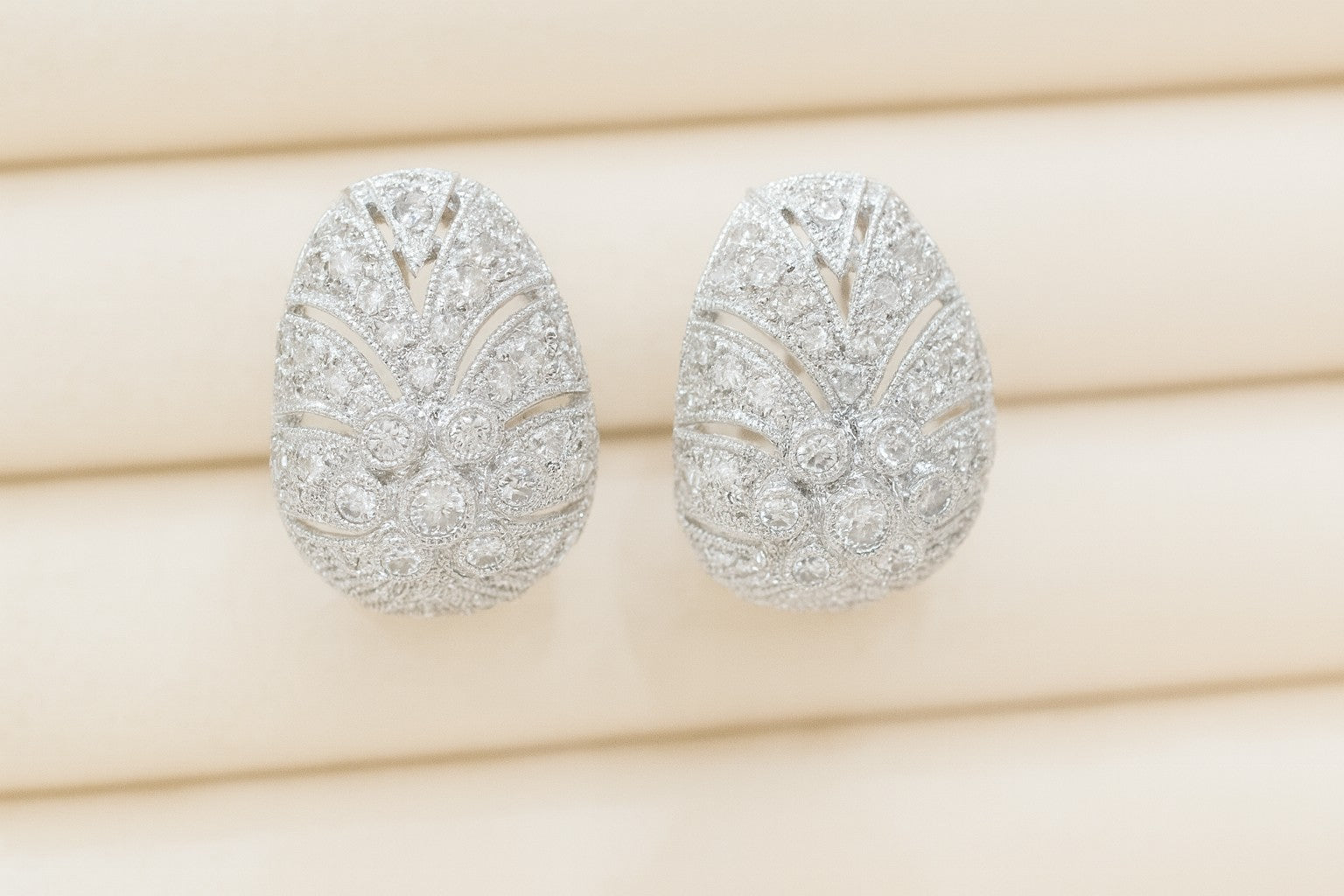 Professionally cleaned, polished and restored to Vintage Darling Jewellery’s boutique presentation standard, these stunning earrings feature 106 natural round brilliant cut Diamonds arranged in a pavé and bezel-set dome cluster design. Each earring is fitted with secure Omega backs, requiring no separate backings.