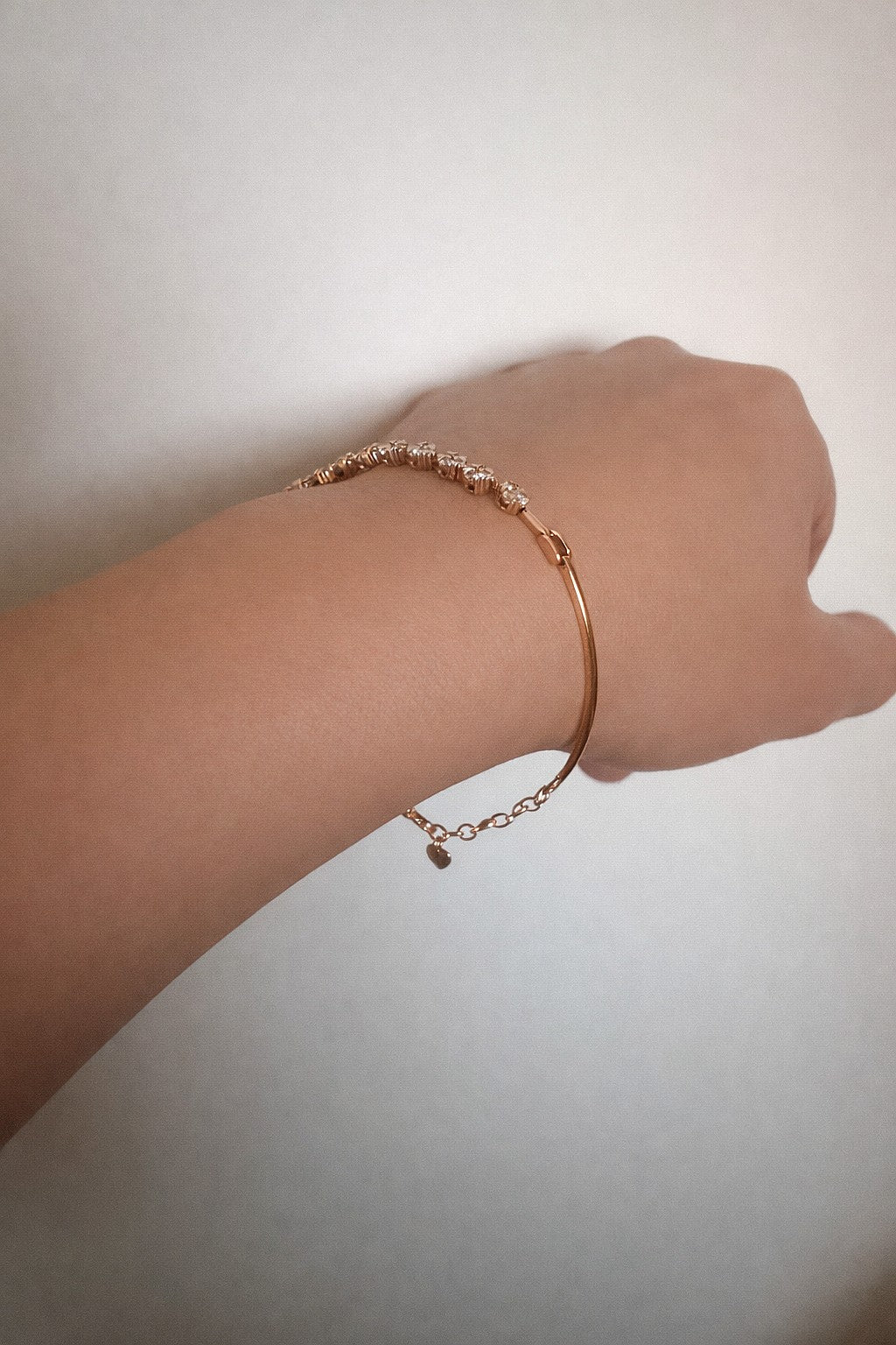 A sleek semi-rigid bracelet with a polished rose gold framework, finished with a central row of floral / clover-style diamond cluster links. The bracelet includes an extender chain for an adjustable fit and is finished with a lobster clasp and heart charm detail.