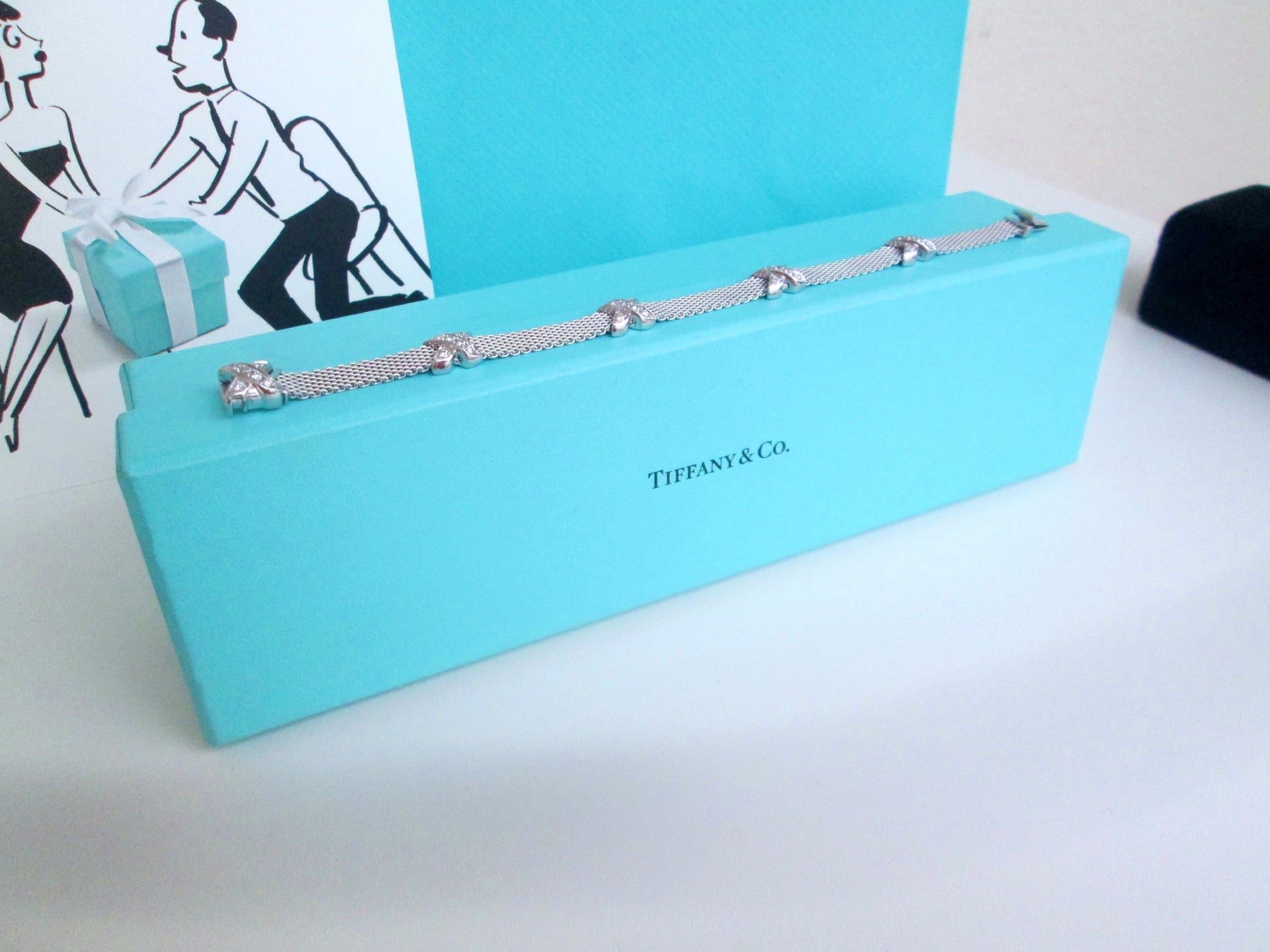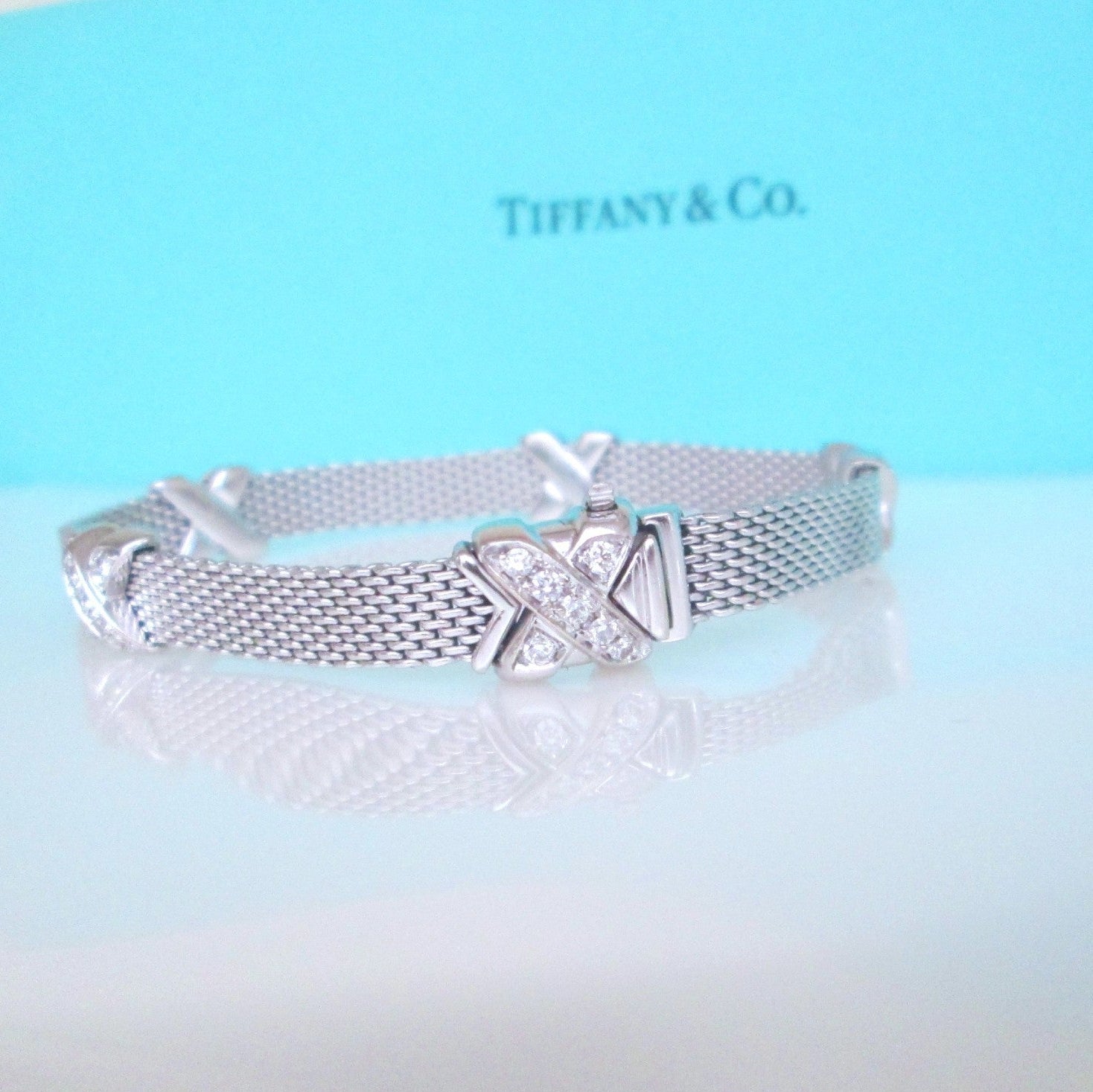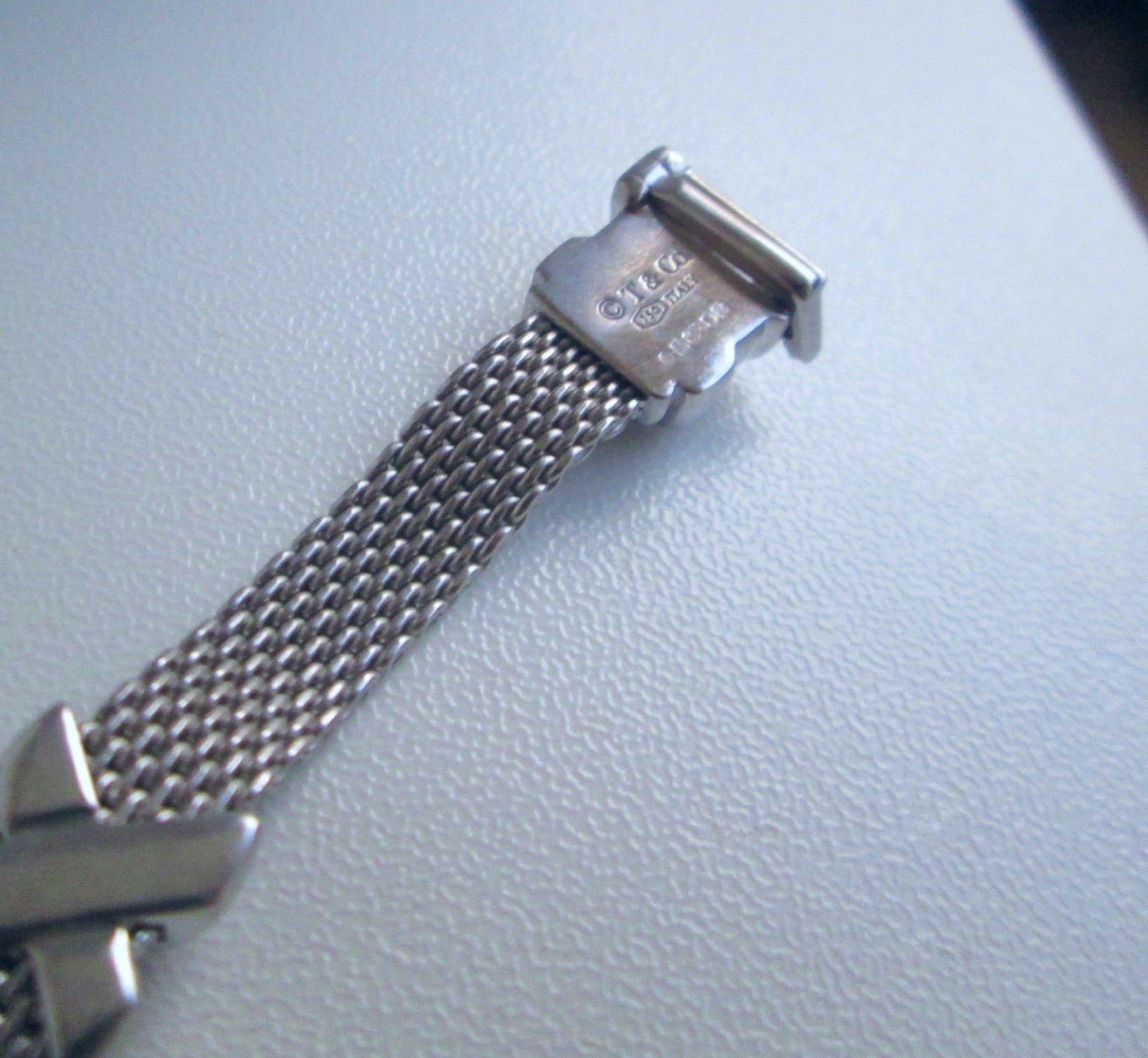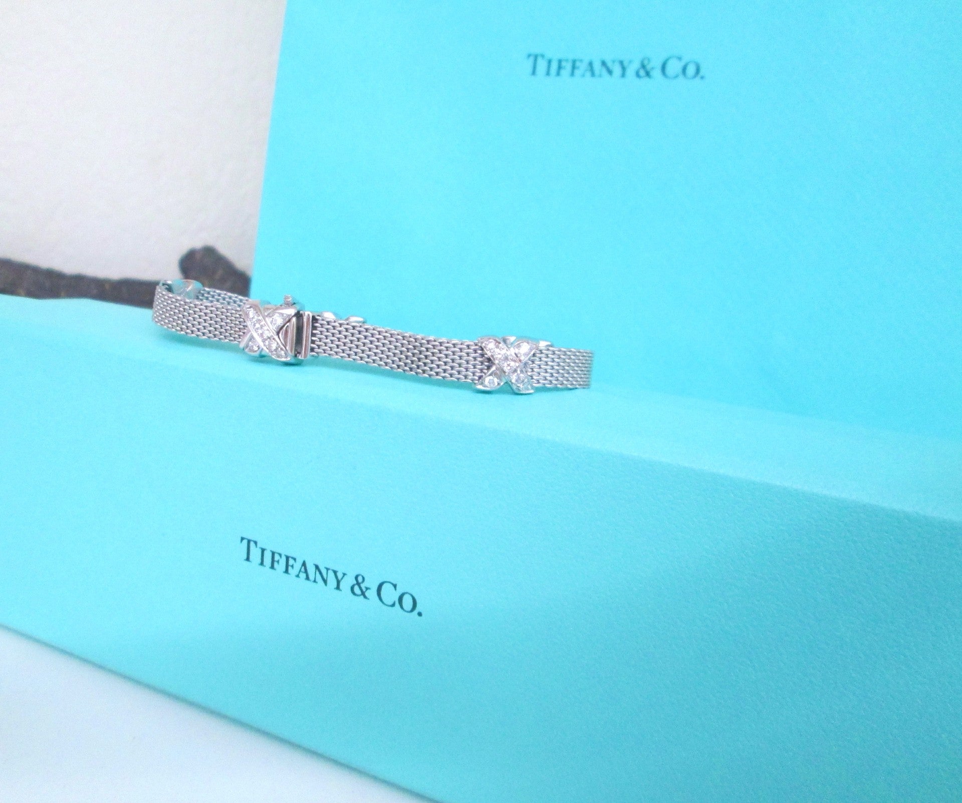 The bracelet features an elegant 6mm woven mesh construction, beautifully finished with Tiffany’s signature cross motif, creating a sophisticated yet distinctive piece. This is not a mass-market Tiffany design, but a less commonly seen and highly collectible bracelet.